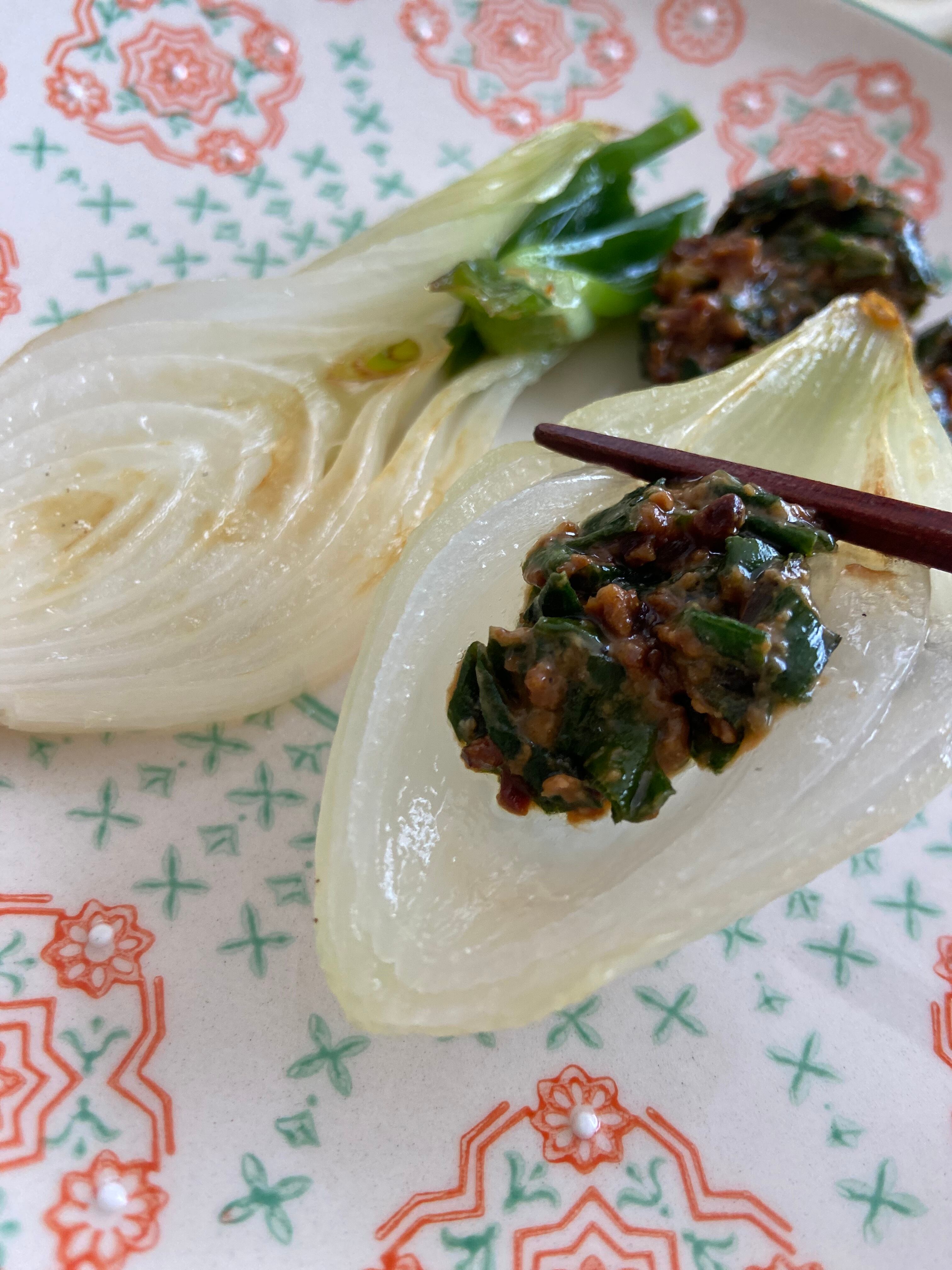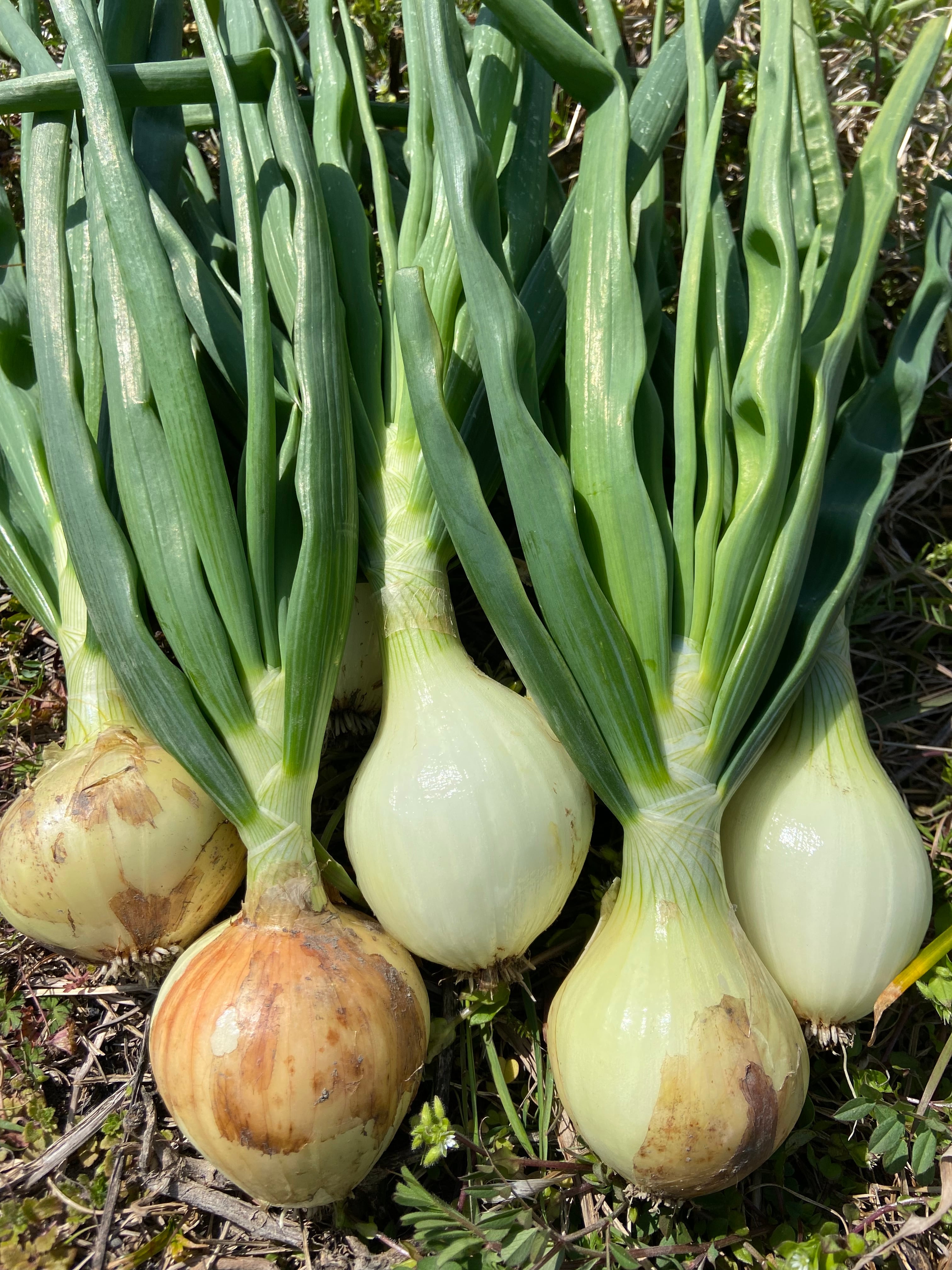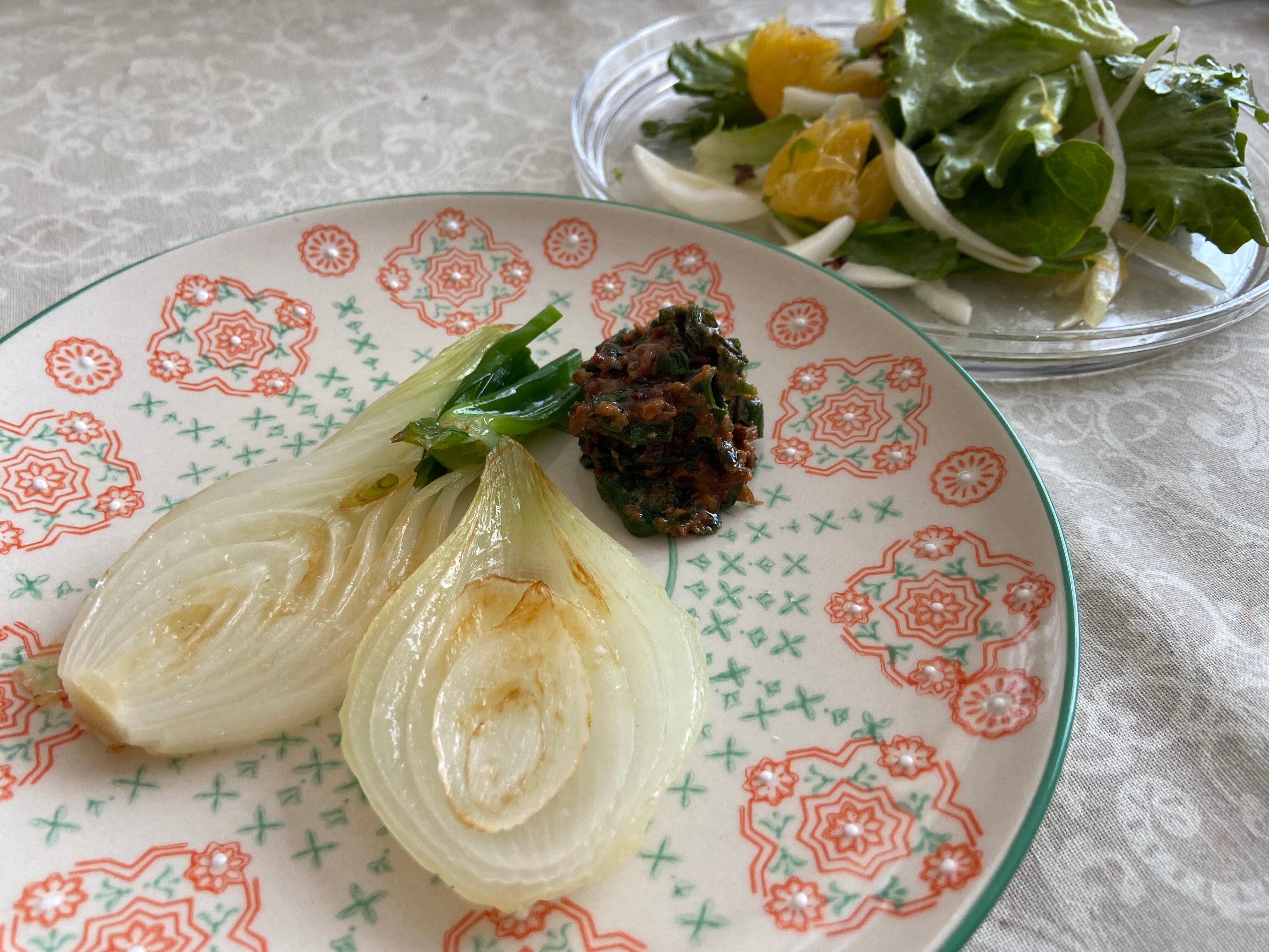 玉の部分が大きくなる前に若採りした玉ねぎで、緑の葉の部分も一緒に食べることができる、一度に2度楽しめる、今の季節ならではの玉ねぎの楽しみ方です。